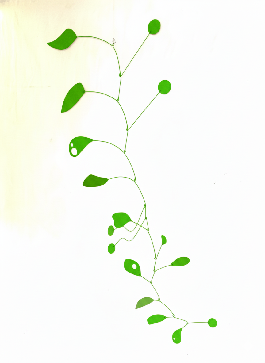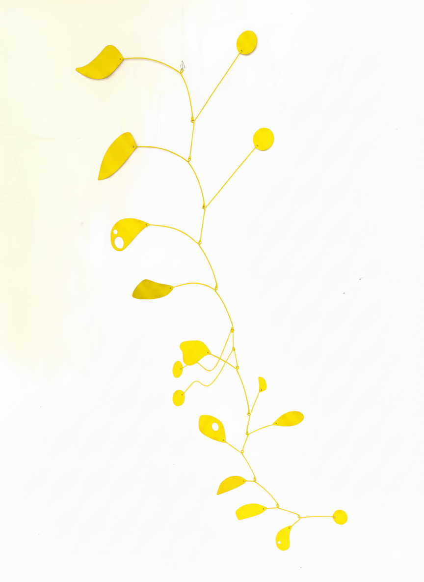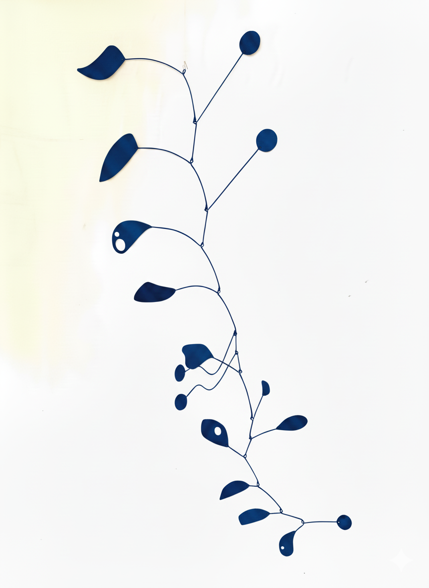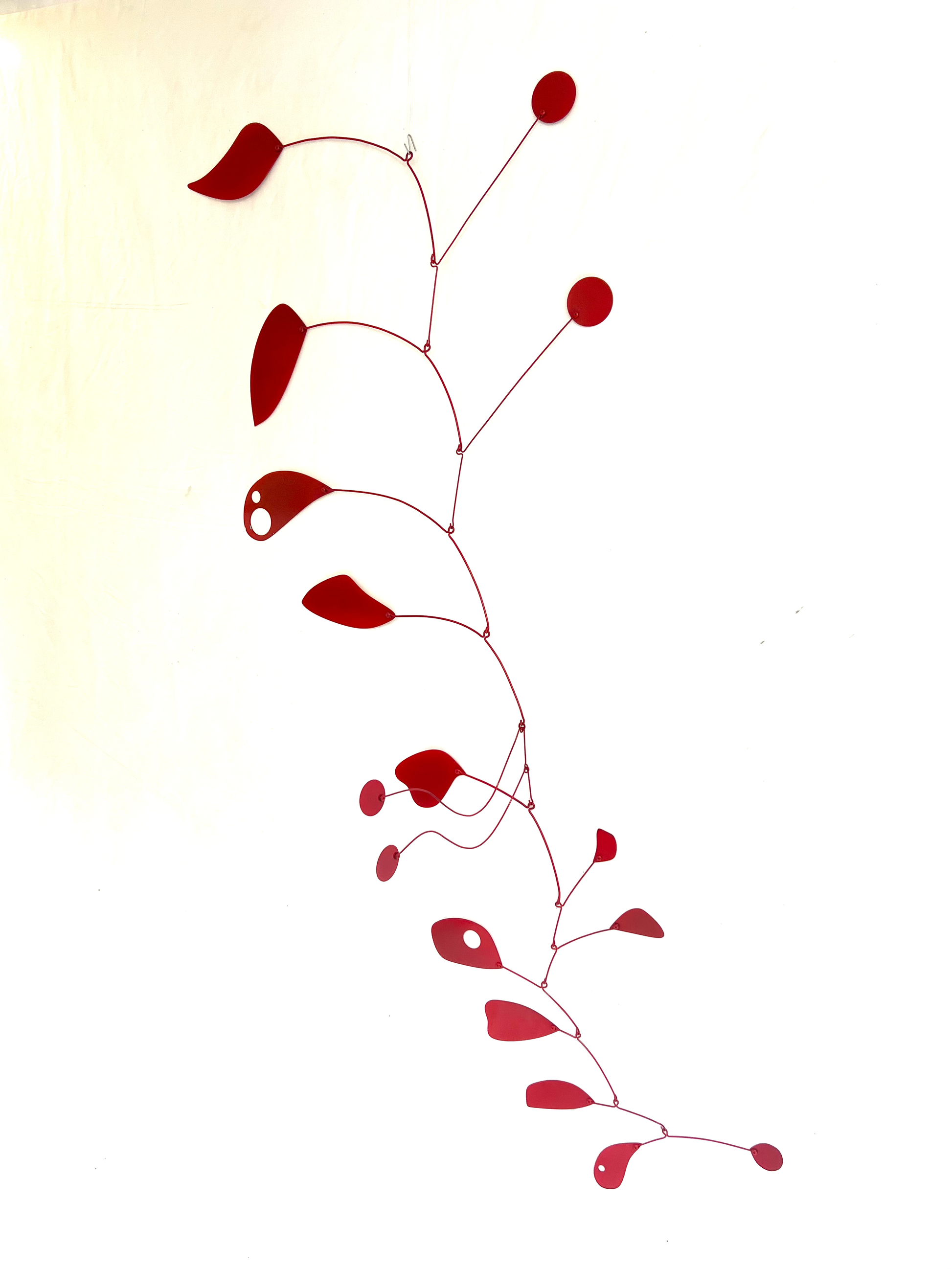 Este móvil para colgar representa la vida en pareja. De su estructura se distinguen dos círculos de distinto color (rojo y azul) que se mueven en forma paralela, pero que todavía no se encuentran. Con el pasar de los años llegan a formar una unidad, representada por dos círculos blancos, en un camino con luces y sombras como sucede en toda relación. Todo el conjunto genera movimientos armónicos sorprendentes a la vista.