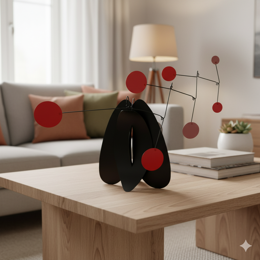Este móvil de superficie FAMILIA representa a una pareja y su decendencia creciendo con cada nuevo integrante del grupo familiar. La pareja (círculos traseros) equilibra y sostiene a todas las demás componentes (círculos rojos). Cada pieza es única y hecha totalmente a mano.