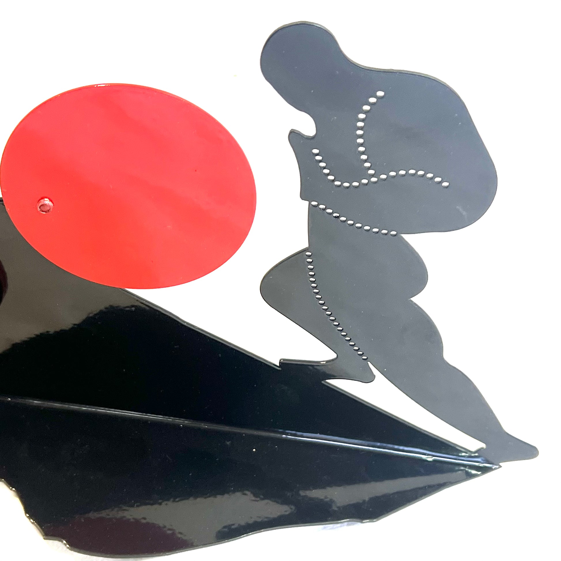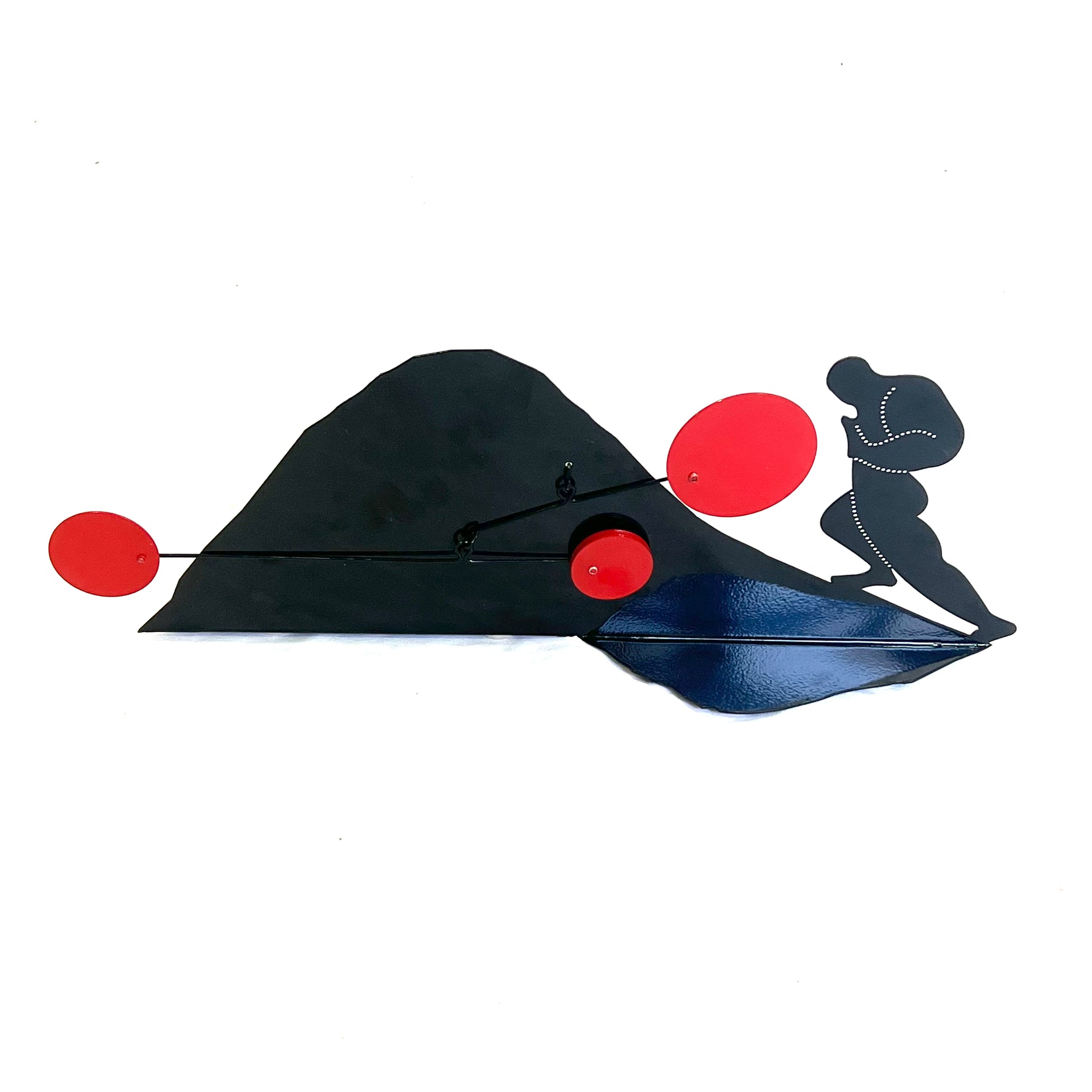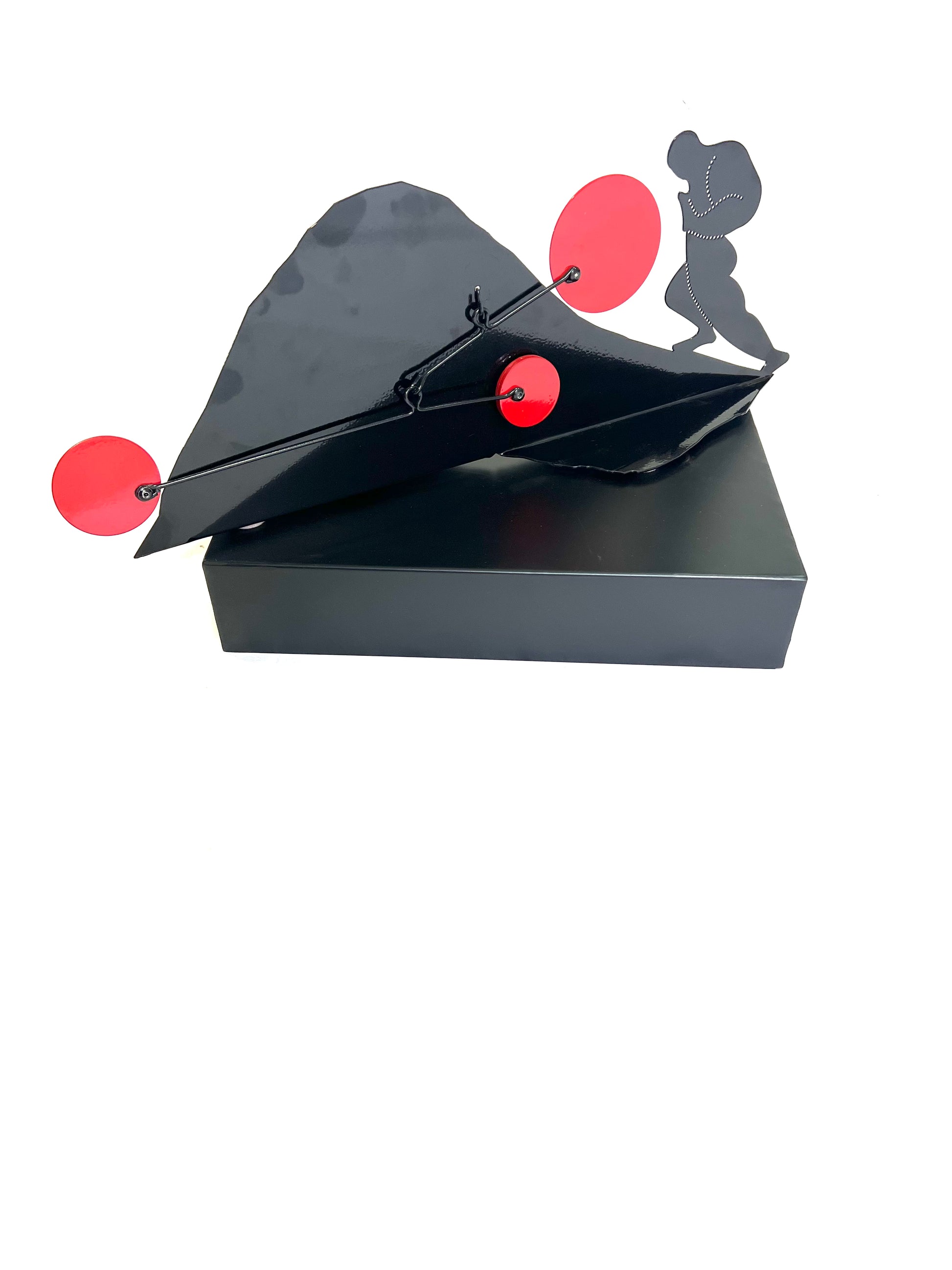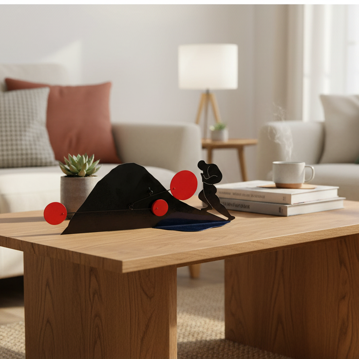 Esta obra fabricada en acero muestra al personaje Sísifo perfilado por su contorno y por los pequeños agujeros que le dan forma al cuerpo del titán subiendo por la ladera de la montaña. Las rocas están representadas por 3 círculos rojos que se balancean, pero siempre retornan a la ubicación donde Sísifo debe comenzar a empujarla cuesta arriba nuevamente.