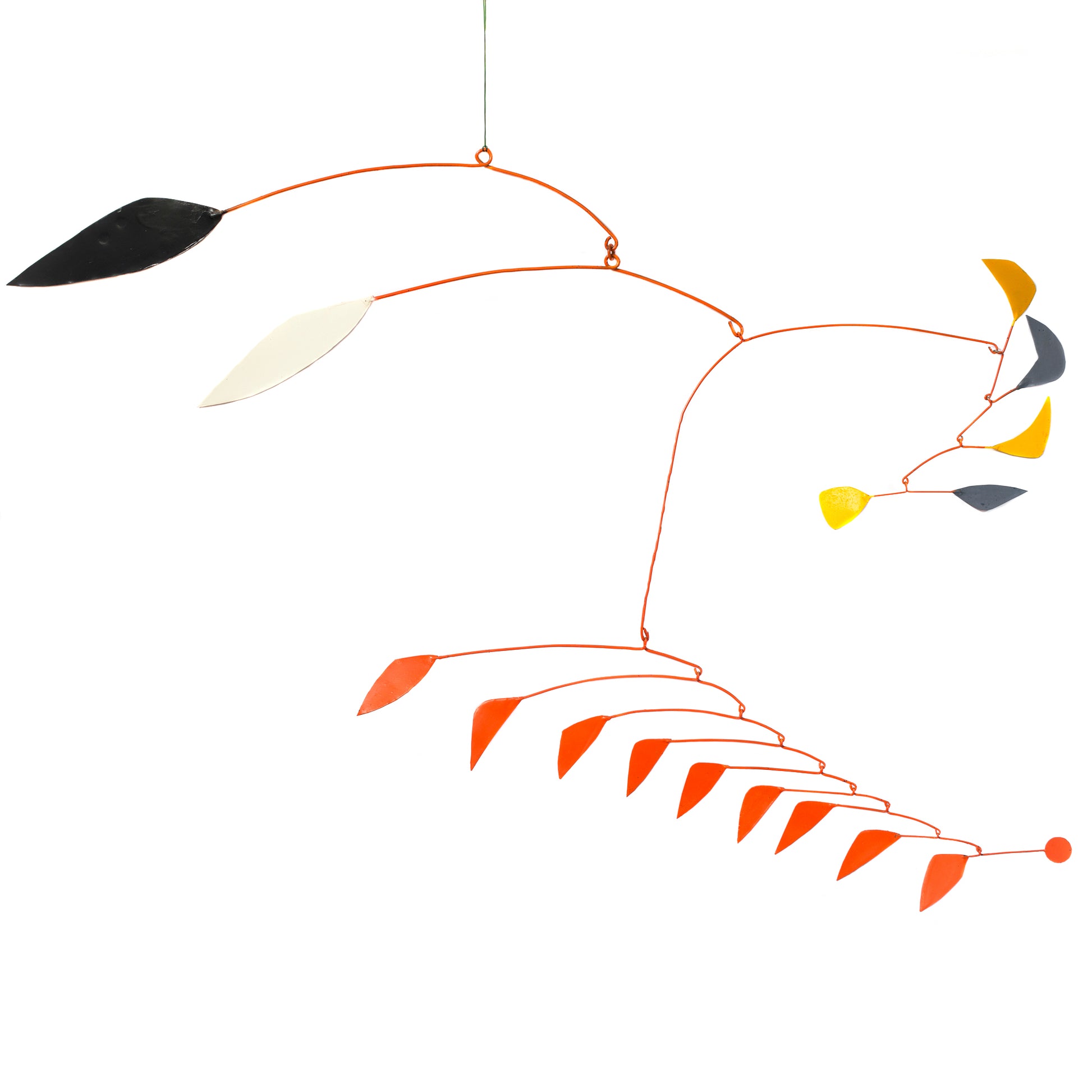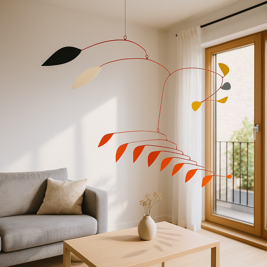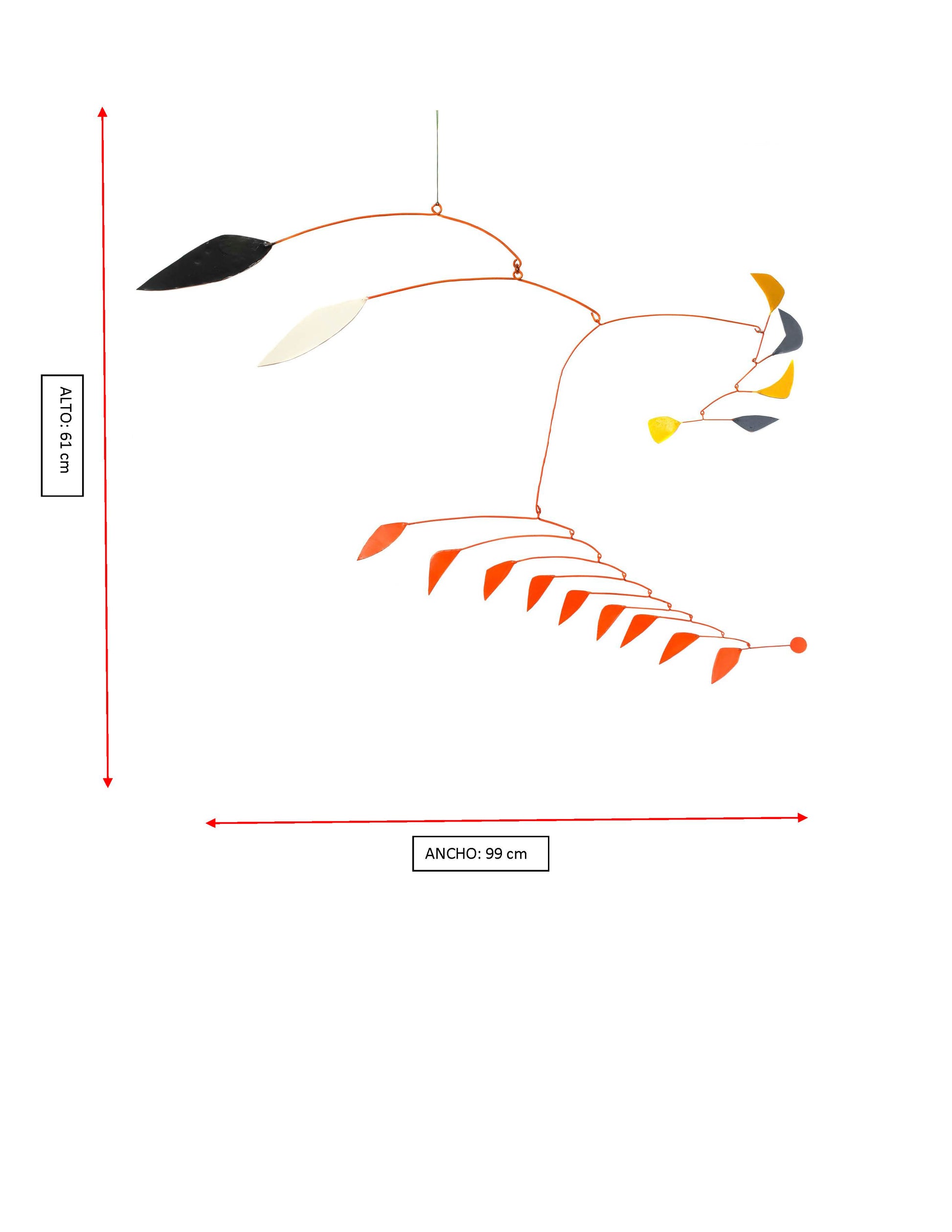 Descripción: Este móvil para colgar Olas es una escultura cinética de múltiples partes hecha en alambre y suaves formas de acero pintadas de alegres colores sólidos, que con el viento genera movimientos helicoidales sorprendentes. El nivel de equilibrio es tan sutil que pareciera que las partes se tocarán unas a otras, estorbándose, pero esto nunca sucede. Especial para adornar espacios altos, livings, comedores, caja de escalas o terrazas cubiertas.